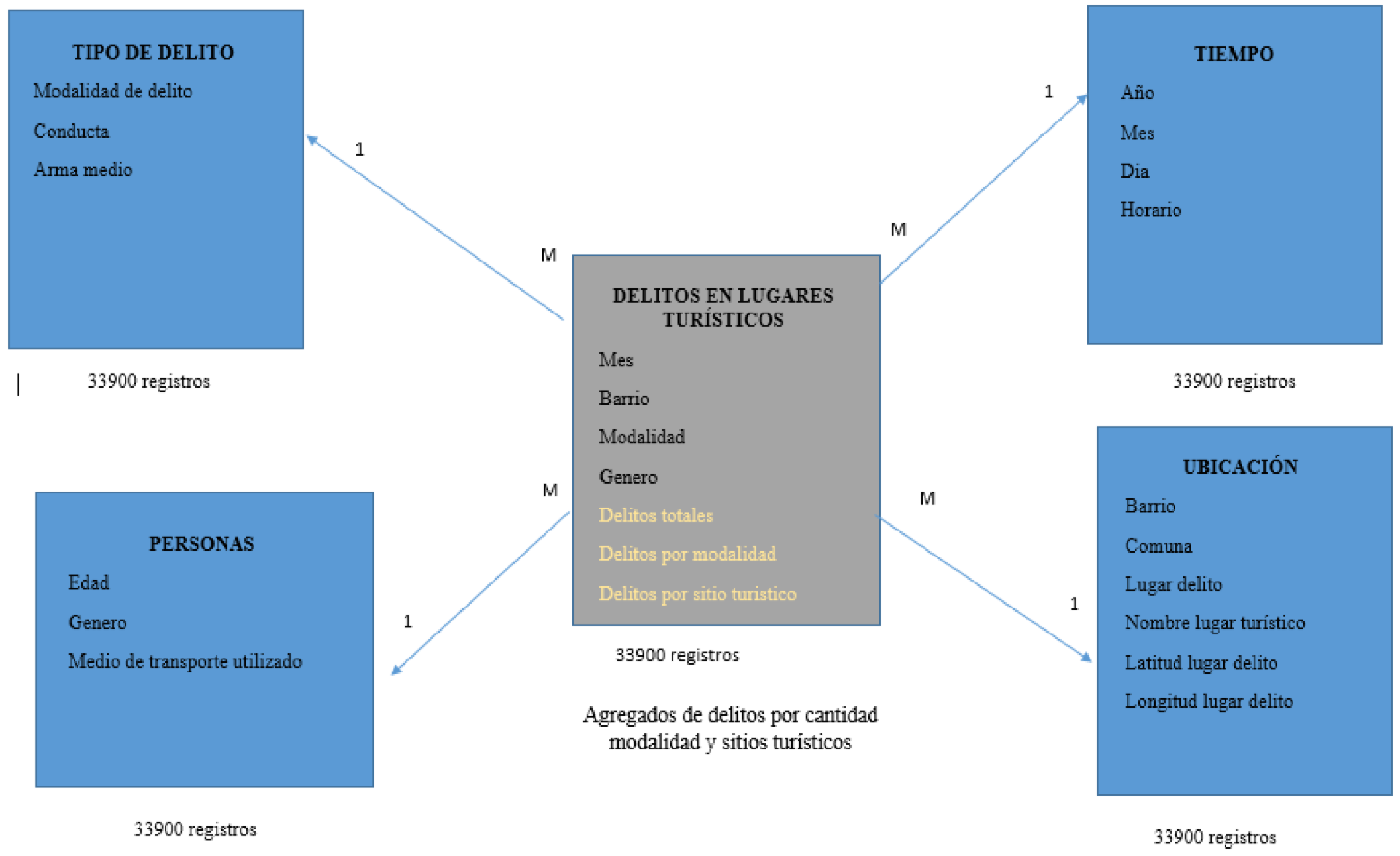 Para unir las dos bases de datos se realizó un proceso manual dado que se intentó por Python y por Big Query y no fue posible, porque se necesitaba tener un nuevo archivo donde por cada delito ocurrido informara si en el barrio de su ubicación se encontraba un lugar turístico, o sino escribir la palabra “no aplica” y para poder realizar las demás operaciones, en Big Query la base de datos debía estar “normalizada”, es decir, solo un delito y sitio turístico por barrio, pero realmente nuestra fuente de información contaba con varios registros por barrio, por lo cual se realizó un “buscar v” entre el campo “Barrios”.