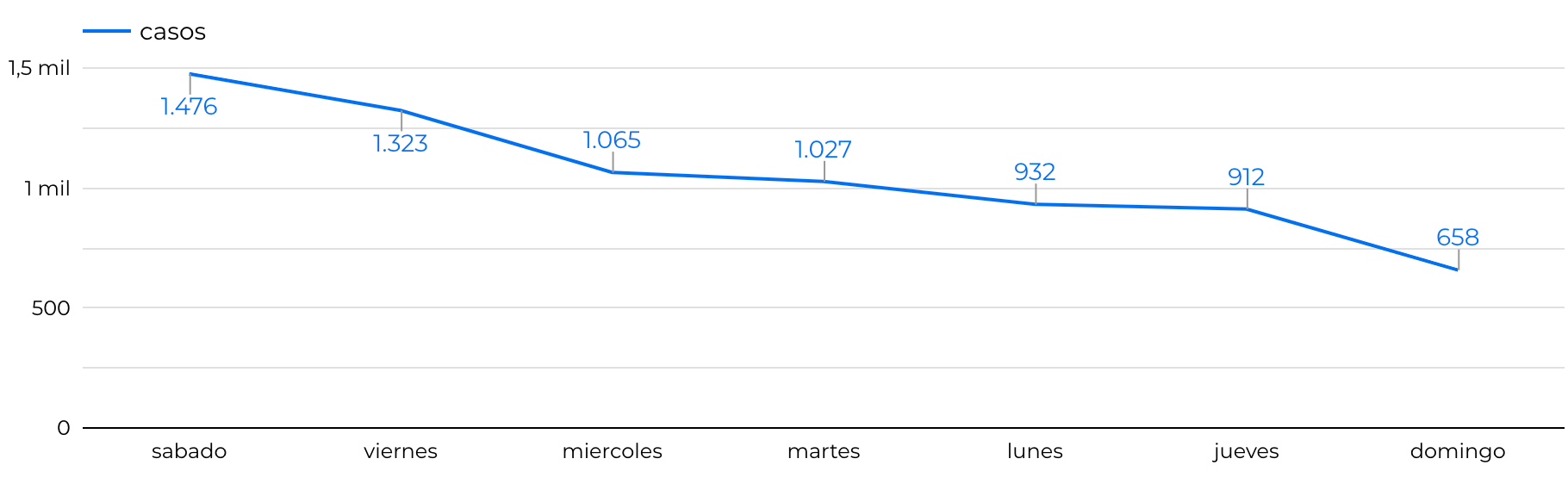 Este tipo de lugares turísticos prestan atención los 7 días de la semana a menos que se presente algún tipo de excepción la cual es mínima, es por esta razón que se indago acerca del comportamiento de los delitos en función del día de la semana, los resultados nos muestran que la mayoría de casos se presentan entre los días viernes (1.323 casos) y sábados (1.476 casos), causa curiosidad debido a que los viernes es un día laboral sin embargo es el inicio del fin de semana así que las personas aprovechan para salir en las noches, el día que menos casos ocurrieron fue el domingo con 658, es curioso debido a que este día la mayoría de gente descansa y podrían aprovechar para ir a alguno de estos lugares. A continuación, se ilustran los resultados mencionados anteriormente: