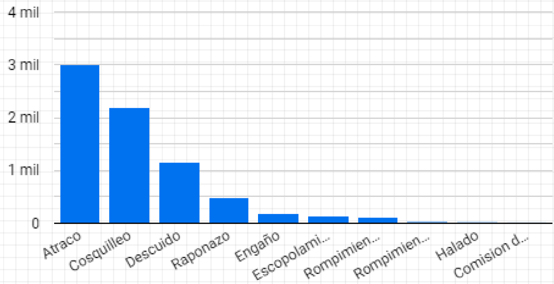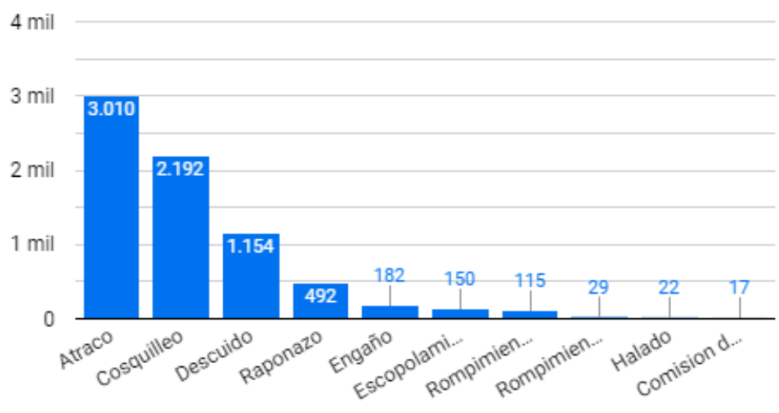 De acuerdo al hallazgo anterior, se indagó acerca de cuál fue la modalidad de delito que más se presentó destacándose 3 modalidades en particular: el atraco con 16.500 casos y una diferencia mínima entre el segundo y tercero lugar como lo es el descuido y cosquilleo, las otras modalidades no llegan hacer tan significativas como las primeras tres, como se ilustrará a continuación: