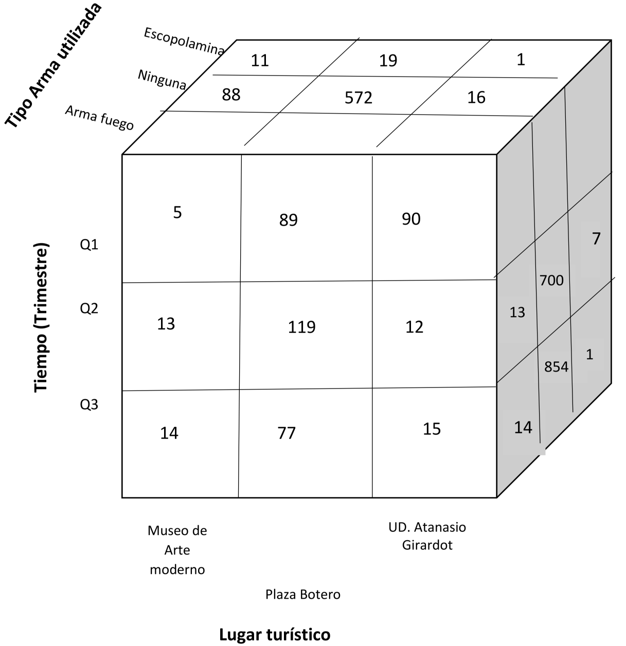 NOTA: el cubo se realizó con las dimensiones de tiempo, lugar turístico y tipo de arma utilizada en el delito, para representar el total de delitos que ocurrieron cerca al Museo de Arte Moderno, Plaza Botero y UD. Atanasio en los primeros tres trimestres del año 2019 y donde se utilizó el arma de fuego, escopolamina o ningún arma para atacar a la víctima.